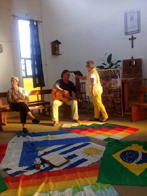Pocha y Virginia prepararon el altar con las diferentes banderas brotando de la Pacha Mama y la Palabra Bíblica en el centro, con el mate colibrí y la luz.